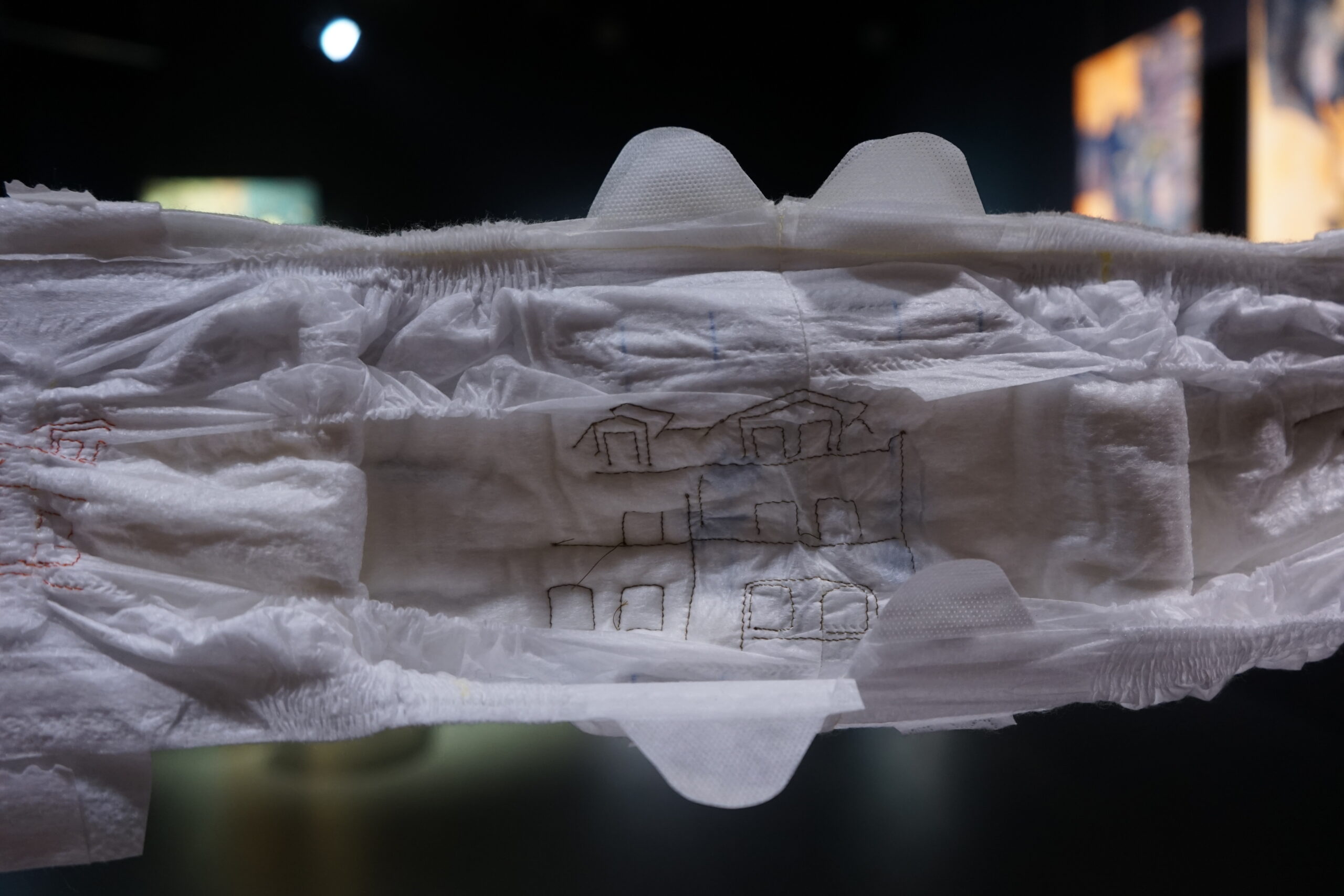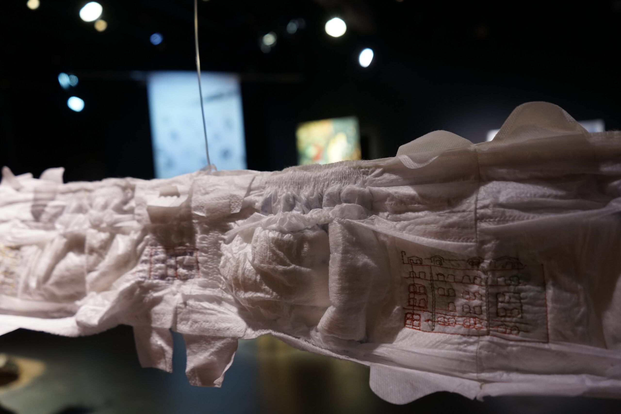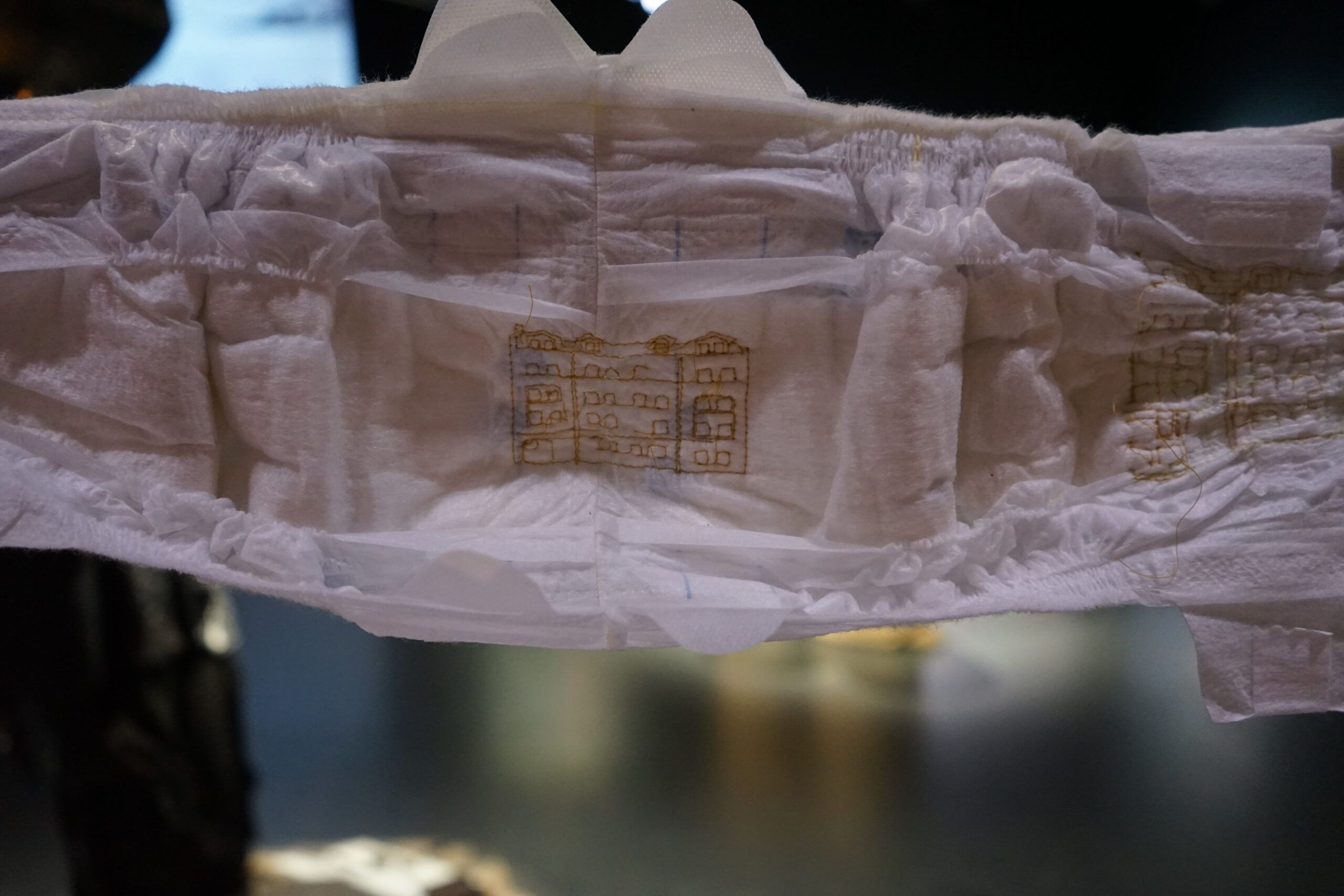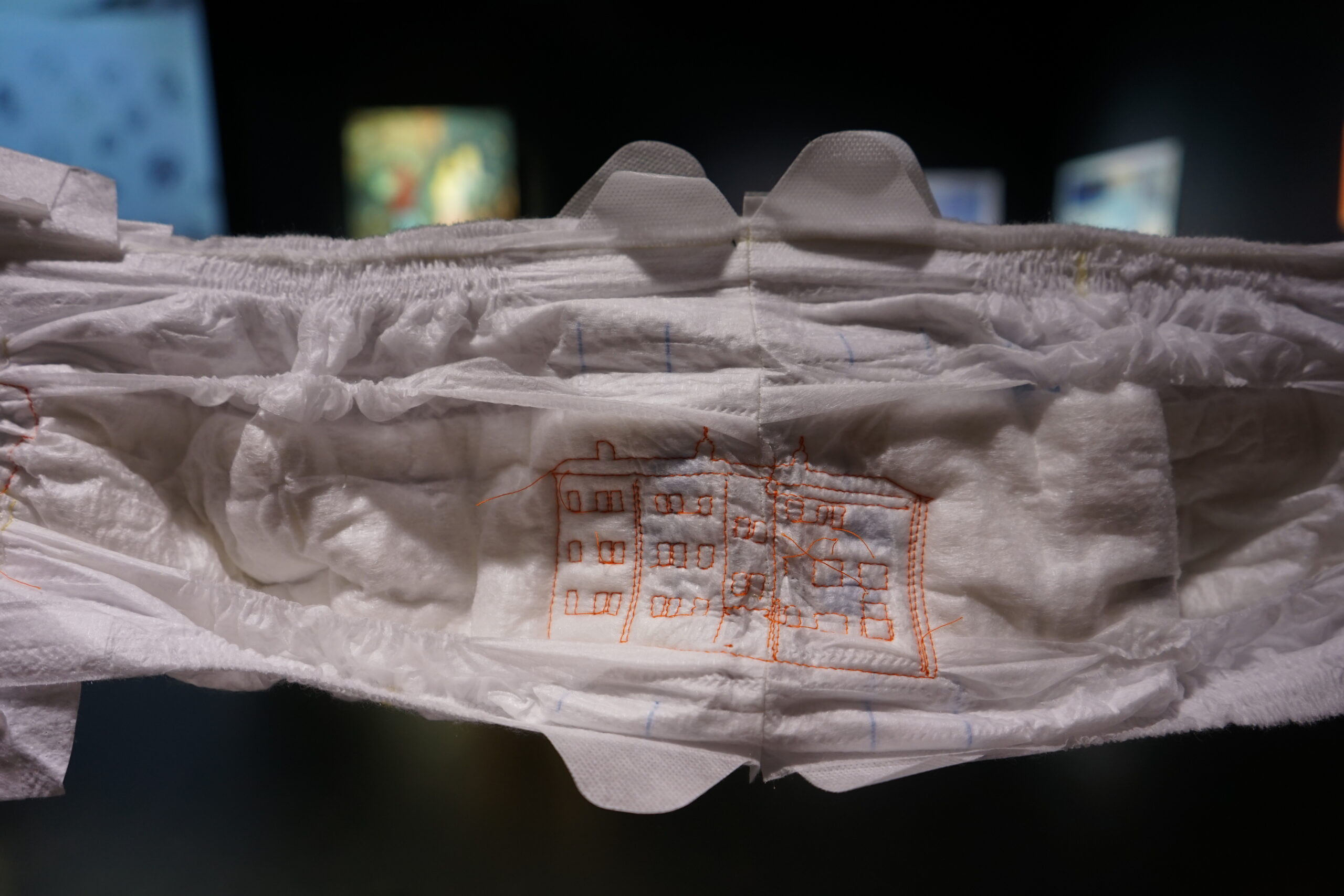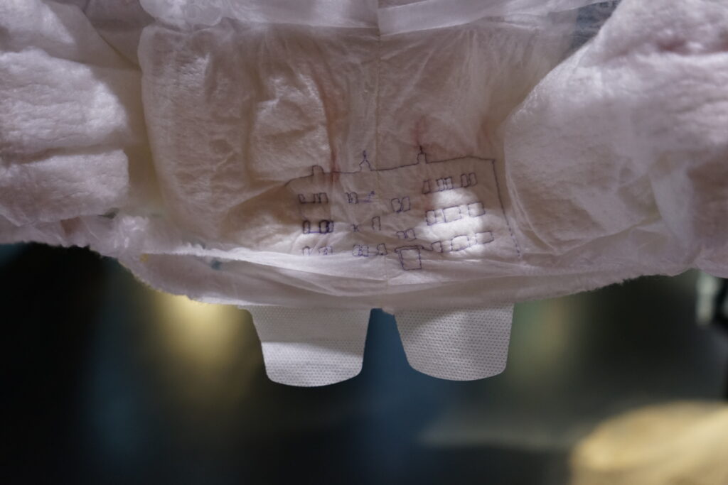(DE) „Wo Wurzeln schlagen?“ — Eine Frage, die sich beim Neuanfang als alleinerziehende Migrantin nach der Geburt eines Kindes stellt. Bestickt, zahlreich, ordentlich aufgereiht und schwebend spiegeln die Windeln den Kontrast zwischen einer überwältigenden Realität und den hoffnungsvollen, träumerischen Vorstellungen einer besseren Zukunft wider.