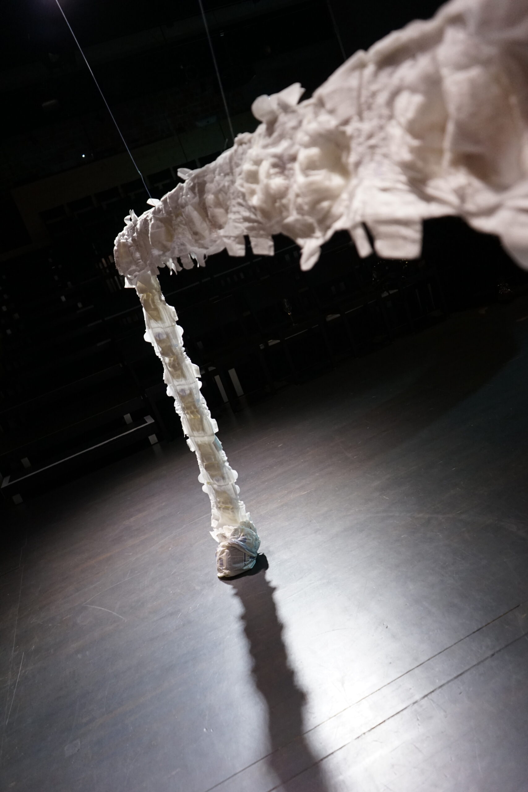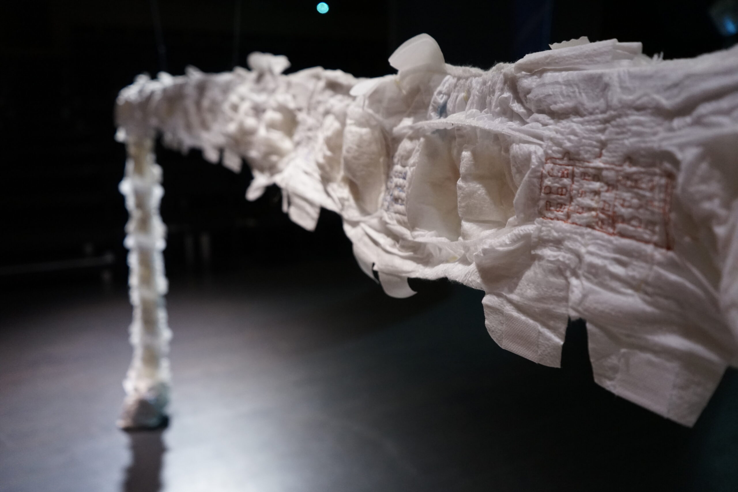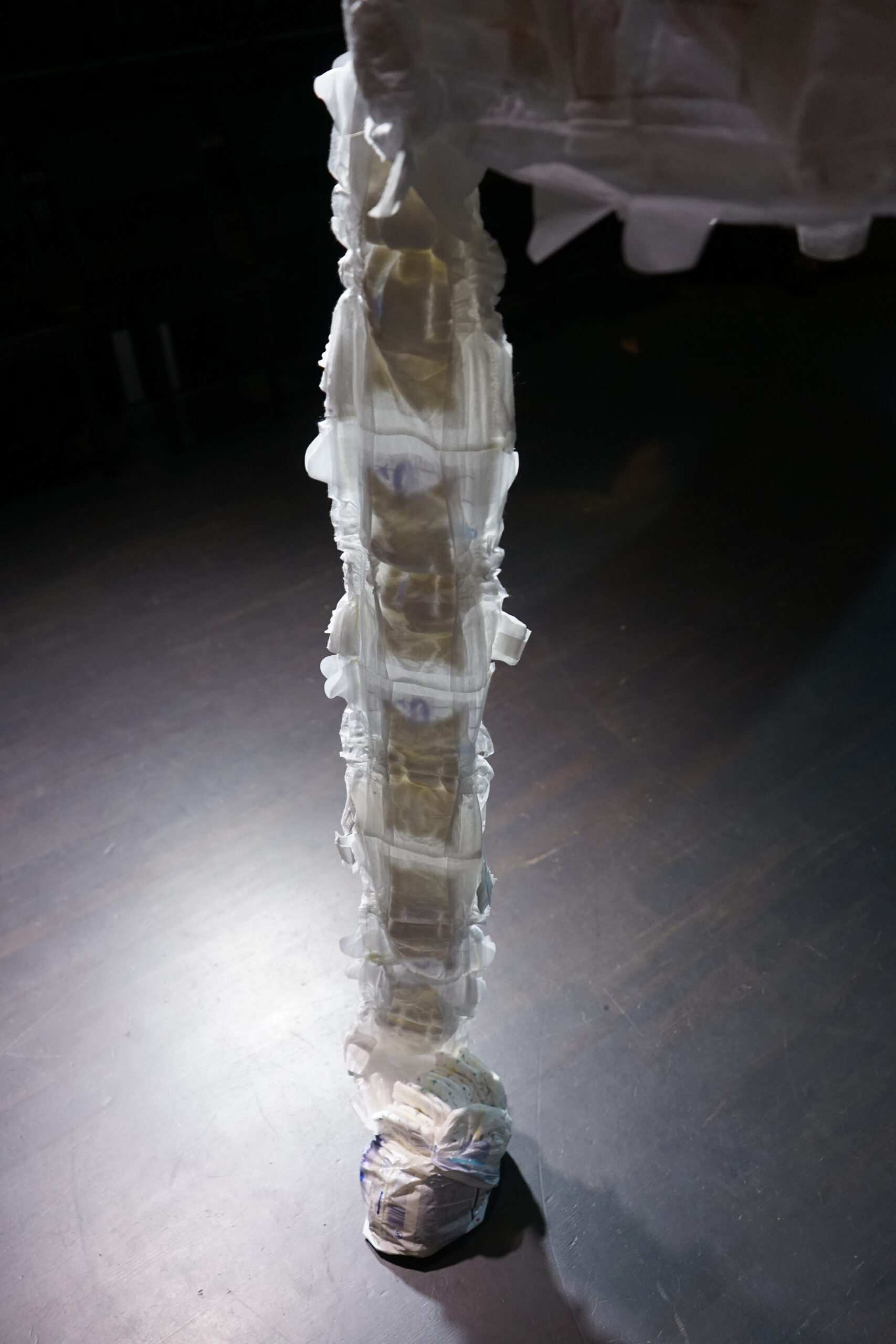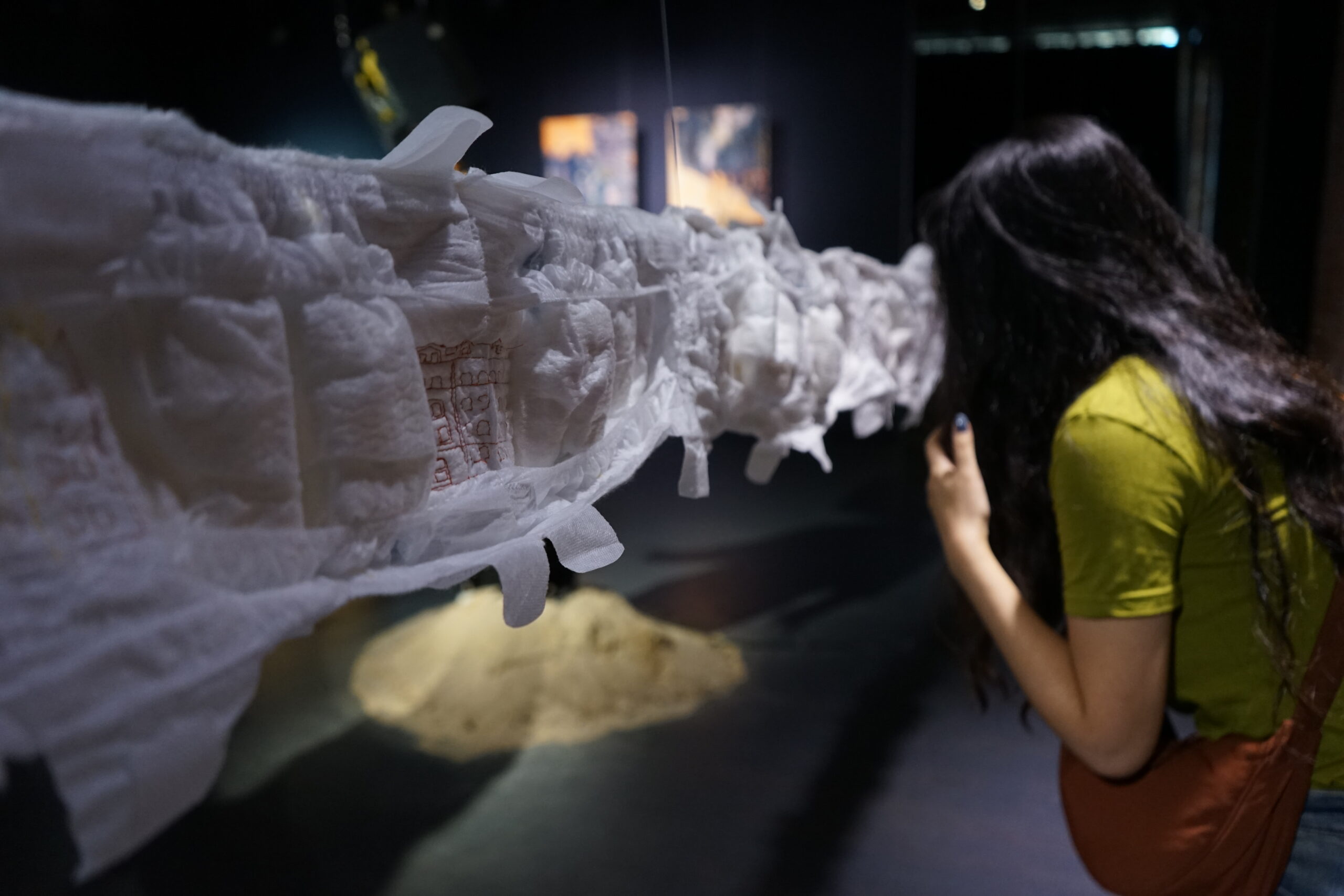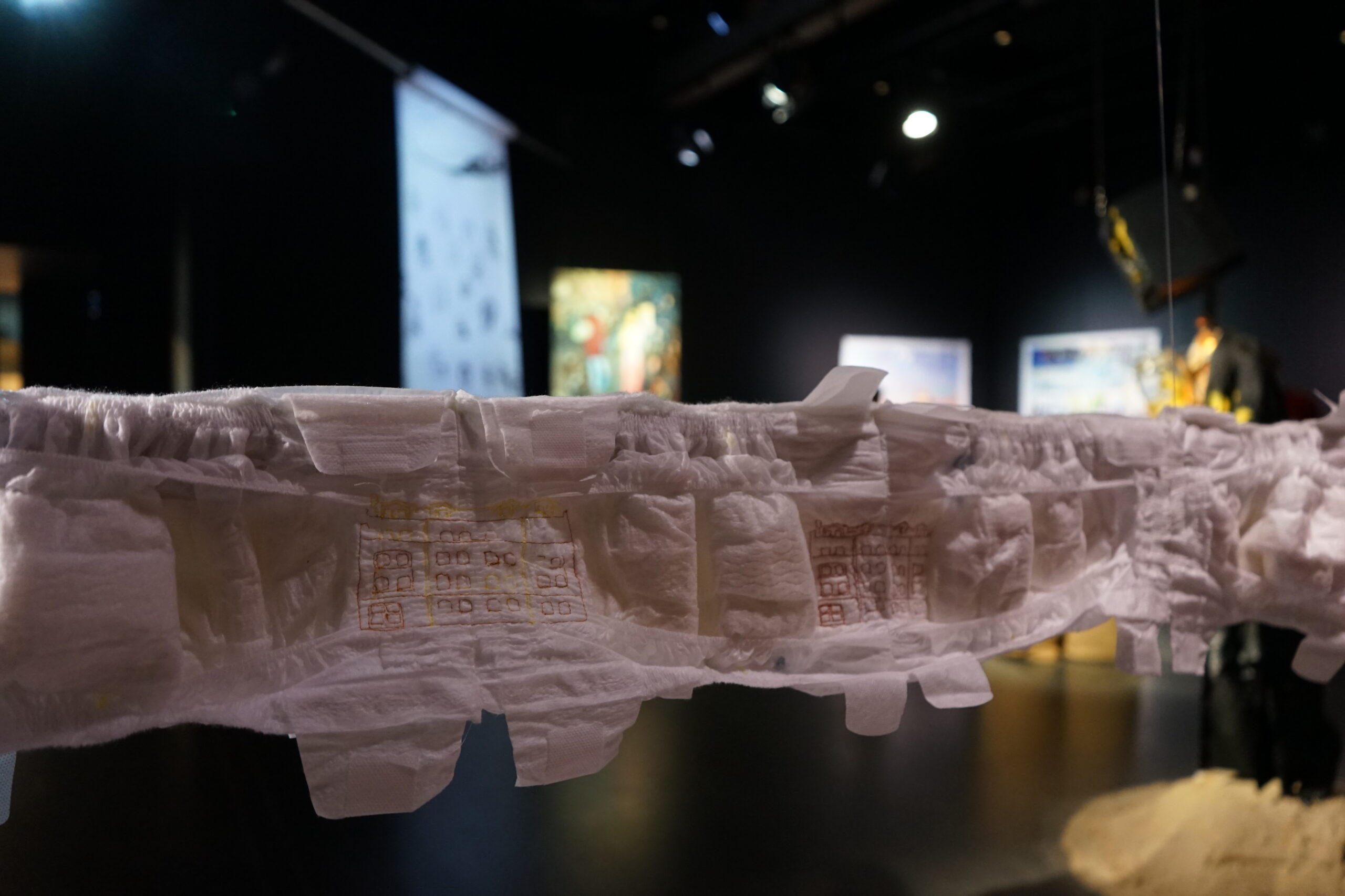 (DE) „Wo Wurzeln schlagen?“ — Eine Frage, die sich beim Neuanfang als alleinerziehende Migrantin nach der Geburt eines Kindes stellt. Bestickt, zahlreich, ordentlich aufgereiht und schwebend spiegeln die Windeln den Kontrast zwischen einer überwältigenden Realität und den hoffnungsvollen, träumerischen Vorstellungen einer besseren Zukunft wider.